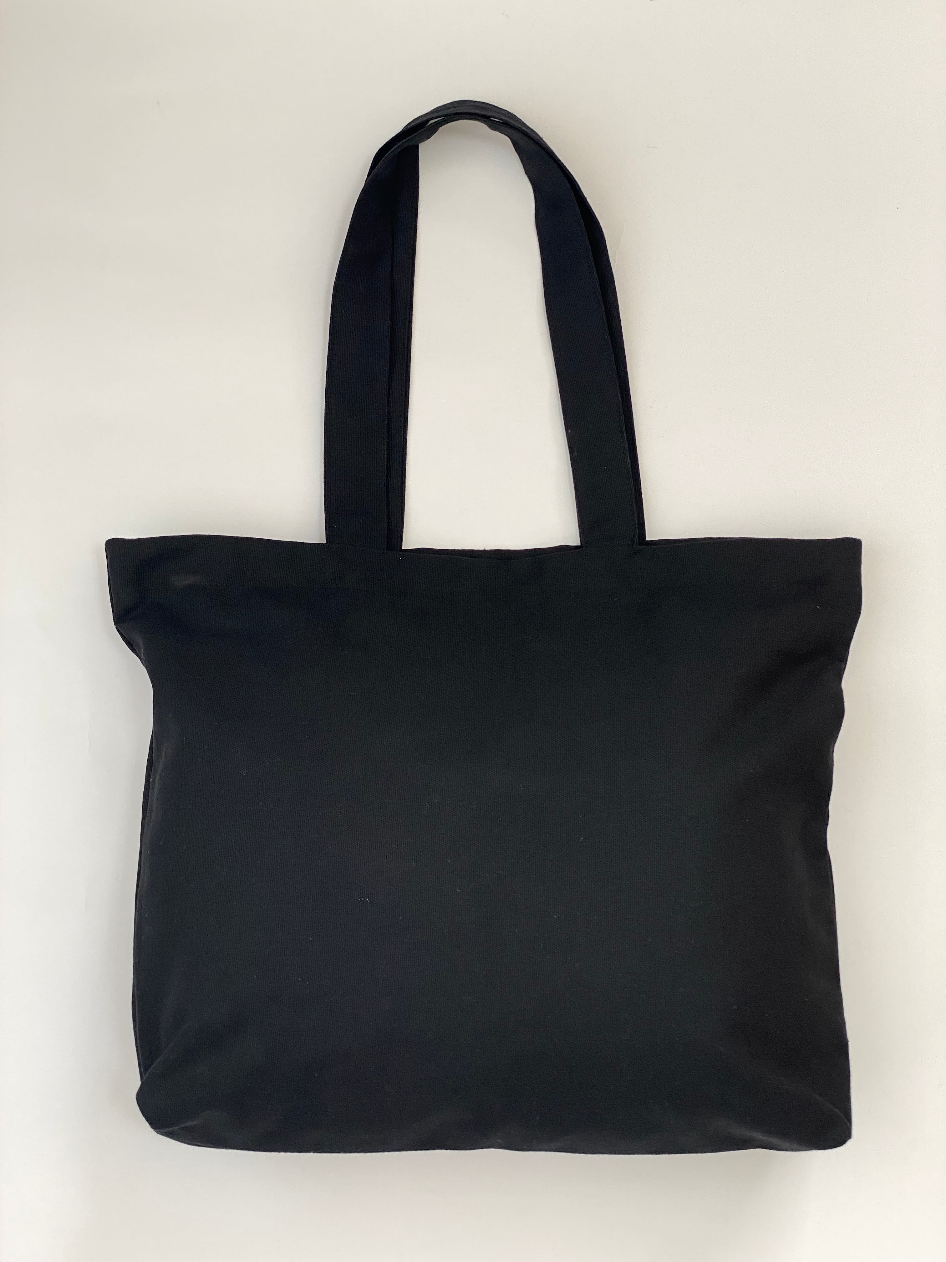 しっかりしたエジプト綿のキャンバス生地でできていて大容量なので何でも入れられるのがうれしいですね。内ポケットもついており、口はチャックで閉められるので、こぼれ落ちる心配もありません。
