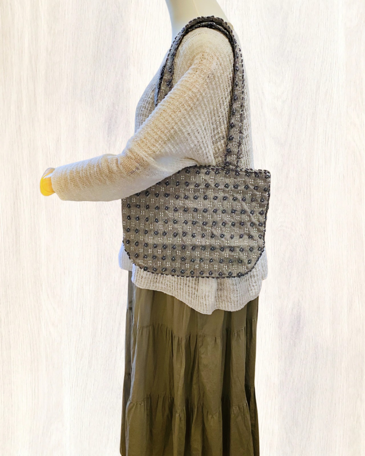 様々な刺繍パターンがある中で一番人気がこのバックのもの。持ち手にまで刺繍が丁寧に施されています。シンプルでオシャレなのでどんな装いにも合わせやすいです。